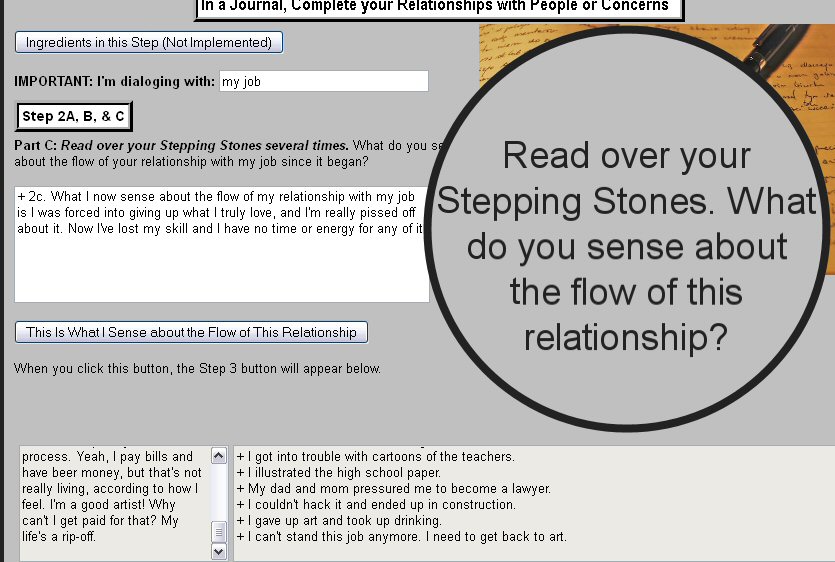 In Step 2b, write 5 to 10 steps in your relationship. In this example, the artist’s first step was “I discovered I was an artist in high school.” When he clicked button #1, this Stepping Stone was moved to the big box at the bottom of the page. He typed six more, and is just about to click button #1 to move the last one down. Since this is his last Stepping Stone, he will then click button #2.