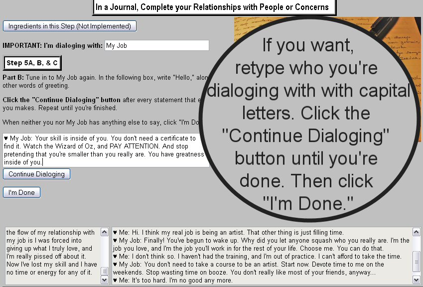In Step 2a, you’ll notice that whoever or whatever you’ve decided to dialog with shows up in the instructions, as well as in the journaling boxes. For instance, in the following example, the words “my job” have automatically been added to the first paragraph of the instructions and the cue that was automatically added to the journaling box.