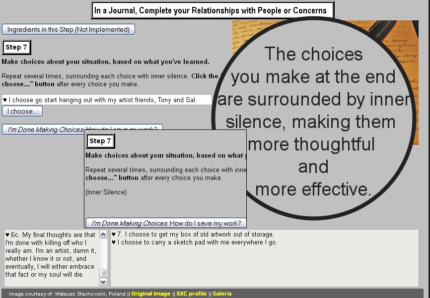 Type a choice for your life into the journaling box, and click the “I choose” button. You will be prompted to clear your mind in Inner Silence, as shown in the inset picture below.